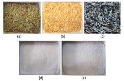 (a) پوسته برنج، (b) پوسته برنج اسيد شويي شده، (c) پوسته برنج خاکستر شده در دماي 500 درجه سانتي گراد (d) پوسته برنج خاکستر شده در دماي 700 درجه سانتي گراد و (e) نانوسيليکاي توليد شده از پوسته برنج