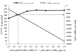 نتایج این پژوهش نشان داد که در غیاب سرفکتنت ها، ضریب یکنواختی توزیع کریستیانسن (CUC) برای بده هوای قطره چکان ها 67- درصد است. میزان افزایش نسبی CUC در حالتی که از ترایتون ایکس-100، توئین 80، نسبت اختلاط 2 : 1، 1 : 1، و 1 : 2 این سرفکتنت ها استفاده شده بود، به ترتیب 211، 162، 210، 213 و 206 درصد به دست آمد. این نتایج به روشنی نشان داد که اولا، افزودن سرفکتنت به آب آبیاری باعث بهبود چشمگیر CUC هوای خروجی از قطره چکان ها می شود. ثانیا، به علت خاصیت برهم افزایی موجود در برخی از سرفکتنت ها مانند سرفکتنت هایی که در این پروژه آزمایش شدند، استفاده از نسبت مناسبی از اختلاط دو نوع سرفکتنت به لحاظ صرفه جویی در هزینه ها و کاهش آلودگی احتمالی محیط زیست، به مراتب بهتر از استفاده از فقط یک نوع سرفکتنت است.